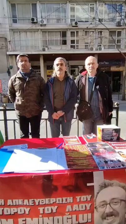 Atina Barosu önünde 3 Şubat Salı günü açılan masada, gizli tanık ifadeleriyle, hiçbir hukuki zemini olmayan soyut iddialarla tutuklanan Av. Naim Eminoğlu’nun yaşadığı hukuksuzluğu anlatan bildirilerden dağıtıldı Saat 10.00-14.00 arasında açılan masada avukatlardan ve Yunan halkından imza toplandı.
