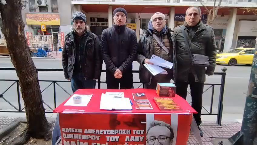 Yunanistan’ın başkenti Atina’da, AKP faşizmi tarafından komplo bir dosya ile tutuklanan halkın avukatı Naim Eminoğlu’na özgürlük talebini içeren imza masası 6. gününde.