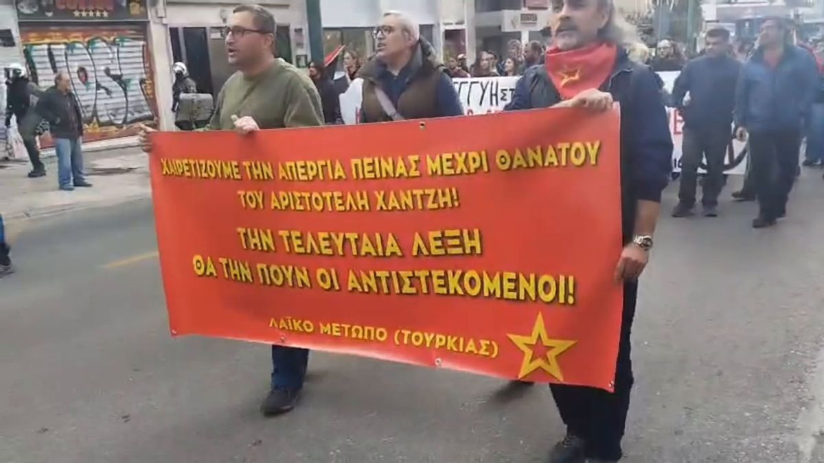 Yunanistan Halk Cephesi de “Aristotelis Hantzis’in Ölüm Orucu Direnişini Selamlıyoruz – Son Sözü Direnenler Söyleyecek” yazılı pankartıyla yürüyüşte yerini aldı. Yürüyüş boyunca “Katil Polis Mahalleden Defol, Yaşasın Ölüm Orucu Direnişi, Kahrolsun Faşizm Yaşasın Mücadelemiz, Direne Direne Kazanacağız” sloganları atıldı.,